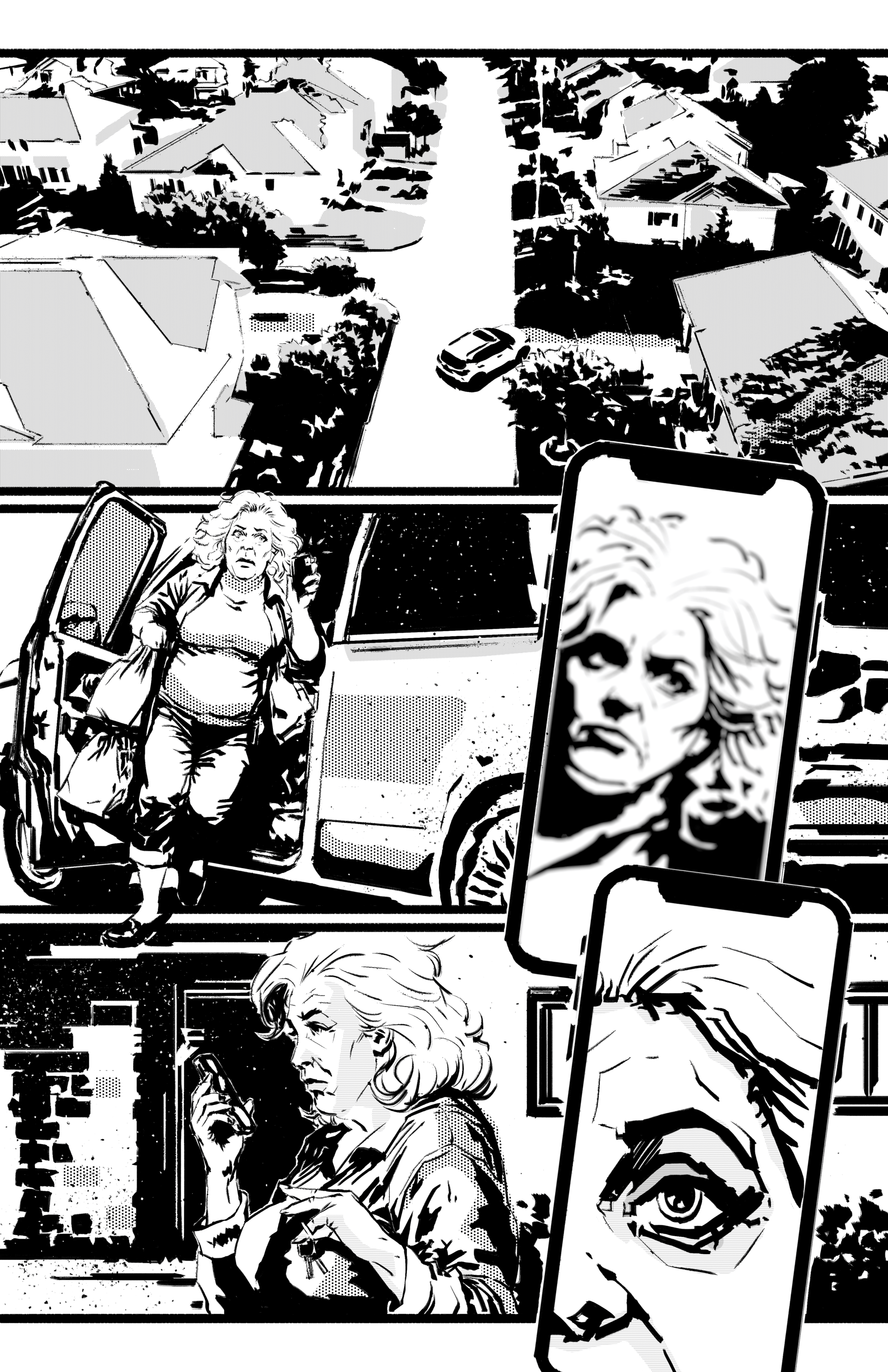 Before we meet Emily, in both the film and the comic, we first get a peek at her quiet neighborhood on a quiet day as she pulls into her driveway. Once she pulls up, she struggles to juggle her keys, the bags she is carrying and trying to use her phone to make a video call to her daughter. As all this happens and she makes her way towards the front door, she is a little spooked to see it open.