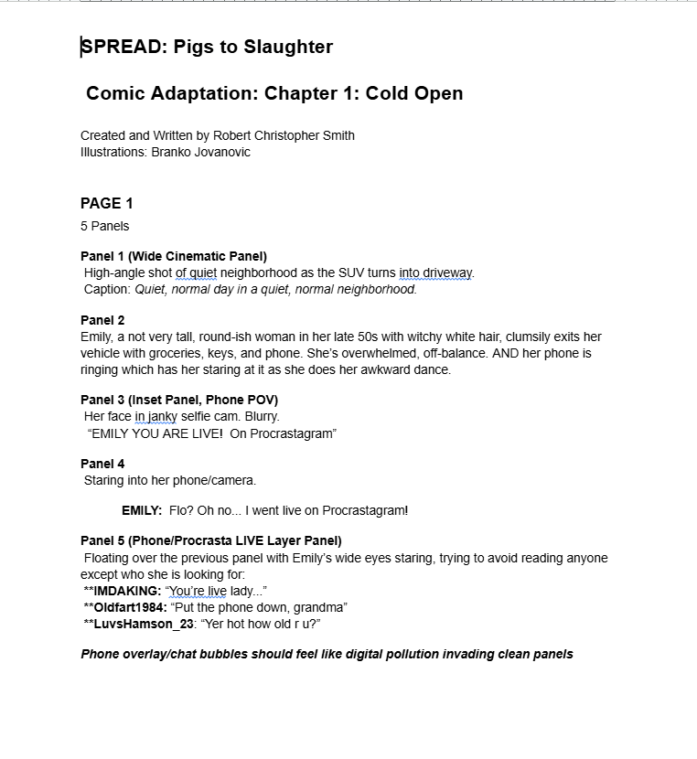 For now though, let’s take a look at a story called SPREAD: Pigs to Slaughter that I co-wrote with indie comics superstar Kurt Belcher back in early 2022, then scripted and filmed later that year. We are currently planning the theatrical premiere and release of the film for November 2025, and I’m scripting it one more time as a comic book, working with Branko Jovanovic and Kurt Belcher as they deliver amazing dynamic pages for the project.