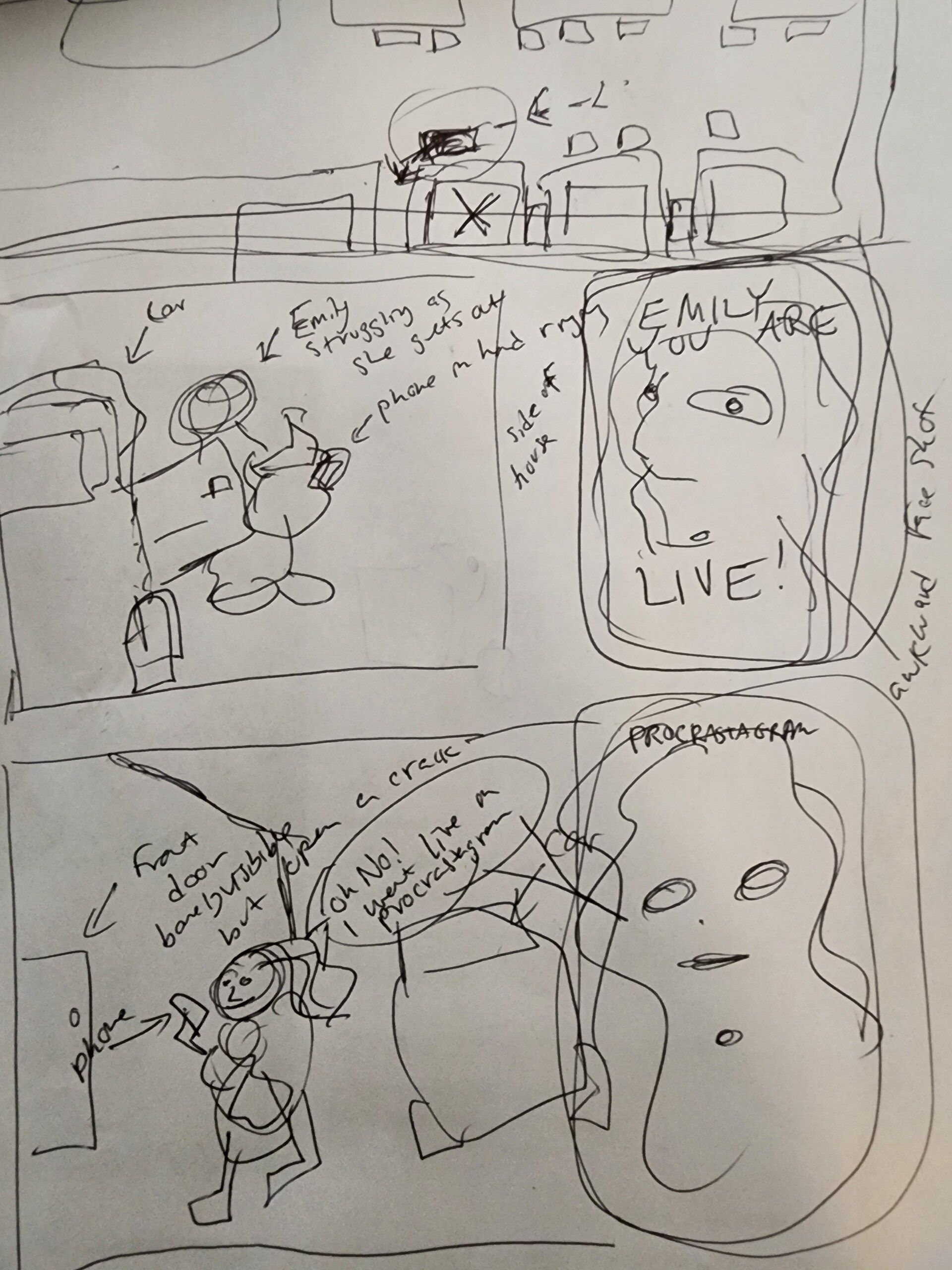 That’s what we’ll see in what I’m showing you here today. What you’ll notice is how each is paced differently to take advantage of the medium in which they are being told. The film plays with time by actually using the seconds of her life on the screen as she struggles with those bags and then her phone pops on screen showing her attempt to contact her daughter and going live on Procrastagram instead (Procrastagram is their version of social media in the story, but it is also where you can get first peeks at the comic AND film here in our world! Check our Procrastagram and follow me there too when you get the chance!). The biggest dilation happens between her car and even seeing the front door that is standing open. In the comic, however, time is manipulated differently for the audience.